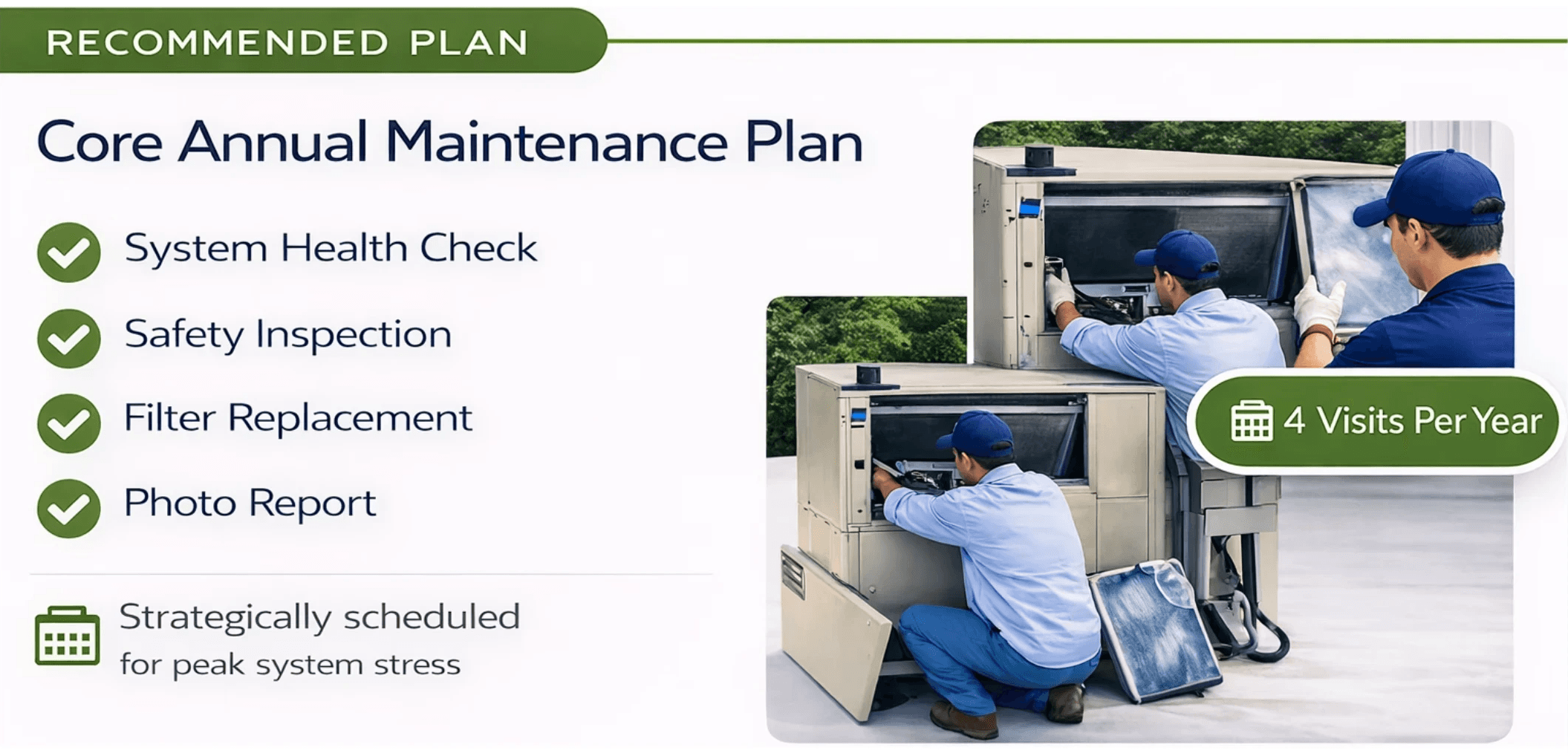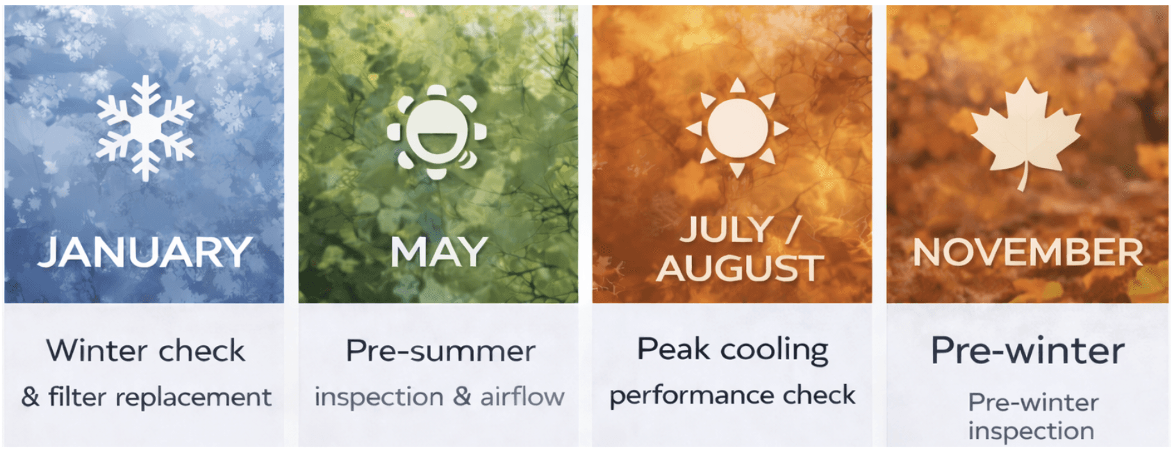 Instead of reacting to breakdowns, we maintain your system before issues start — at the right time each year. Each visit is scheduled strategically to match seasonal system stress.
